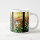 Glasfönstrets färgåtergivning av en Hollyhock-Blomsterträdgård med en sten-trädgård med en ström i bakgrunden Art är på denna Jumbo-Mugg. 20 Okt uppvärmningsvätska under dessa kall dagar och nätter.
