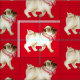 Cute stollig som går på pug hund med en röd buktie och hans näsa i luft. Roligten upprepar mönstrad hund på en röd bakgrundsstruktur. Ursprunglig vattenfärgsmålning och design av Sarah Trett för www,mylittleeden.com