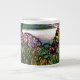Den vackra vintagen Tiffany Art nouveau Stached Glass Window Reproduction of Irises bredvid en sjö i ett skogen ligger på Jumbo Mugg.