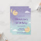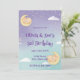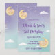 Inbjudan till tvillingbarnskalas med sovande djur, måne, stjärnor, lila och mintgrönt
