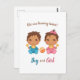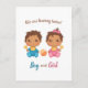 Söta tecknade bebisar, pojke och flicka, i blå och rosa rompers och gula halsdukar som håller matchande skallror.