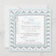 Söta jumper med polka-pricktryck med mjuk blå slips och bojkott på garderoben och 3D-blixt och band för twin pojkars inbjudningskort för babydusch. Färger är mjuka blandningar och gråtoner.