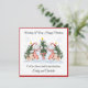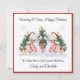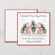 Det här julkortet är lämpligt för tvillingflickor på deras första, andra eller tredje jul. Designen inkluderar en röd ram, ljusblå snöflingor, akvarell-julgranar, godisbitar, presenter och tvilling-snowmän.