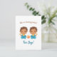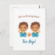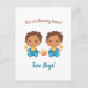 Söta tecknade babypojkar i matchande blå overaller och gula halsdukar som håller i babyrasslor.
