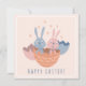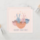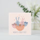 Kaart met illustratie van twee paashaasjes in een eierdopje. Tekst voorkant 'happy easter' (kan aangepast worden)