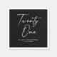 These stylish cocktail napkins feature a clean, modern “Twenty One” script design printed on a deep black background, creating an elegant and sophisticated look for any 21st birthday celebration. The crisp white calligraphy adds a refined contrast, making the napkins perfect for upscale parties, dinners, cocktail nights, or minimal milestone events. The design is modern, bold, and versatile, matching effortlessly with monochrome, silver, gold, rose gold, and contemporary neutral color palettes. These napkins add a polished touch to drink stations, dessert tables, and bar setups, and they also look great in event photos. They are practical for serving cocktails, snacks, or cake while elevating the overall decor. Perfect for elegant minimalist parties and black and white themes.