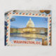 This postcard captures the United States Capitol glowing against a soft evening sky, its reflection shimmering across the wet pavement below. Surrounded by travel‑themed accents—maps, stamps, and the promise of adventure—the scene evokes the excitement of exploring one of America’s most iconic destinations. A timeless keepsake for travelers, history lovers, and anyone inspired by the grandeur of Washington, D.C.