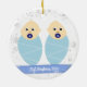Trendig, elegant och söt personlig Första jul-Twillingarna Pojke Ornament för gudföräldrar med vit ram med snöflingor och stjärnor. På framsidan finns en rundöppning för ett foto av två anpassningsbar och två foto av två gudföräldrar och två blå band, på vilka namnen av nyfödda visas i ett modernt typsnitt / typografi, och den andra anpassningsbarna: "Vår första jul som Godföräldrar" Baksidan har en bild av tvillinggrafik spädbarn, som du kan behålla eller ersätta med ett foto, och anpassadet "Första jul 202Y" i blått band.