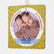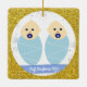Trendig, elegant och söt personlig Första julen Twillingar Pojke Ornament för morföräldrar med vit ram med snöflingor och stjärnor på en (faux) gyllene glitter bakgrund. På framsidan finns en rundöppning för ett foto av två anpassningsbar från pojke och mor- och farföräldrar och två blå band, på vilka namnen av nyfödda visas i ett modernt typsnitt / typografi, och på den andra anpassningsbarna: "Vår första jul som morföräldrar" Baksidan har en bild av tvillingformat spädbarn, som du kan behålla eller ersätta med ett foto, och anpassadet "Första jul 202Y" i blått band.