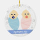 Trendig, elegant och söt personlig Första julen Twillingar Pojke Girl Ornament för gudföräldrar med vit ram med snöflingor och stjärnor. På framsidan finns en rundöppning för ett foto av anpassningsbar nyfödd bebis, flicka och gudföräldrarna och två band, blått och rosa, på vilka framsidan av nyborna visas i ett modernt typsnitt/typografi, och den andra anpassningsbarna "Vår första jul som Godföräldrar" Baksidan har en bild av två spädbarn, som du kan behålla eller ersätta med ett foto, och namnen "Första jul 200 2Y" på ett blått band.