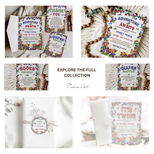 Skogsdjur äventyr i en vild bär under. Tekskogens vänner - björn, hjort, tvättbjörn, räv, bonny och hedgehog - utforskar en krans av jordgubbar, blåbär och botaniska blommigtar. Denna beundransvärda twillingar i vattenfärgen Boho inbjudan är perfekt för babyduschar i vår eller sommartid i gender-neutralt.