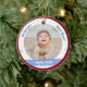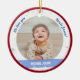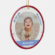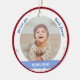 Trendig, elegant och söt personlig Första julen Baby Ornament för twin pojke för en favorit-morbror med ett vitt ram med snöflingor och stjärnor som har en rundöppning för ett anpassningsbar-vågrät-foto och ett böjt blått band på vardera sidan som visas namnens namn eller twillingar i ett elegant-skript/typografi. På framsidan av ord står "We kärlek you, farbror Jason!", som du kan anpassa eller ta bort. På baksidan finns en anpassningsbar för spädbarnens första jul. Med en yttre Julafton röd ram.