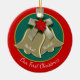 Anpassa din första jul-träd tillsammans med den här elegantens anpassningsbar-datum och text runt dekoration. Tryckta bilder i rött, grönt och guld-toner har två klockor på framsidan och en guld ser hjärtat på baksidan för en romantisk beröring. (Ingen verklig metall, glitter eller band etc. i fysisk form). Skapat delvis med CU-grafik av Zaza på Skraps och kuber.