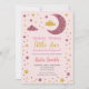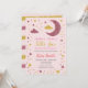 Den här lilla babyduschinbjudan med liten stjärna, söt och elegant, har baby rosa bakgrund med stjärnor för guld och rosa glitter, måne och moln. Den omvända sidans utformning är ett alternerande faux guld och rosa glitter rand.