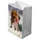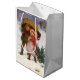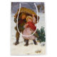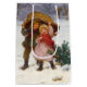 Vintage illustration of a boy and a girl joyfully dragging a holly tree through the winter forest while carrying a basket over their head to protect themselves from the falling snow. Nostalgic oil painting by English artist Frederick Morgan.