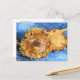 A postcard with the fine art painting by Vincent van Gogh (1853-1890), Two Cut Sunflowers (1887). Two dried flowers against a brilliant blue background.