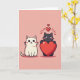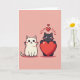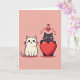 This card shows two simple cartoon cats sitting close together on a soft pink background. The cat on the left is white with big black eyes, tiny pink cheeks, and a small, calm smile. Next to it, a black cat hugs a large red heart in its paws, looking up with a sweet, hopeful expression. Above the black cat are several smaller red hearts floating upward, with short dashed lines that make it feel like the love is rising into the air. The drawing uses a small set of colors—mostly pink, black, white, and red—so the message feels clear and focused on affection. There isn’t any text on the front in this design, so the cats and hearts do all the talking ❤️💌. It feels like a cozy little moment of friendship and love, perfect for Valentine’s Day 🍫.