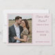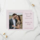 Design features the photo you provide as main design displayed against a pale pink background and framed by an elegant, dusty-rose colored border. To the right of photo, your text containing heading, names and city & state of wedding are displayed in a matching dusty-rose font.