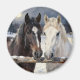 A magnet with an illustration of two horses on a snowy winter ranch with a full moon in back of them standing behind an old rustic fence.