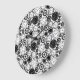 Two images show a round wall clock with a black and white pattern of various clock faces and gears. The first image is a front view; the second shows an angled view.