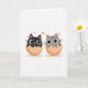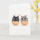 This greeting card shows two stylized kittens peeking out from cracked eggshells on a soft white background, with a gentle, friendly closeness between them 🐰. The left kitten is a deep charcoal color with wide dark eyes, a small sweet smile, and ears lightly tinted pink. Beside it, a light gray tabby with fine stripes and rosy cheeks looks calmly outward, as if sharing a quiet moment with its companion. Thin whiskers curl from both faces, adding a simple, lifelike touch without making the scene feel busy. Small red hearts float above and between their heads, suggesting affection and an easy bond 🐇. Any greeting text would sit near the top in a light gray tone, leaving plenty of open space around the illustration, while a short sign-off could be placed along the bottom in soft pink. The eggshell halves are shaded in warm tan and brown with jagged edges, framing each kitten like a little nest.