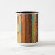 This 15oz Two Toned Combo Mug is covered with an abstract rustic design in shades orange, brown, and turquoise.