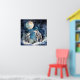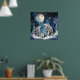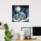Two wolves in winter with snow, stars and moon