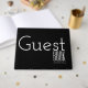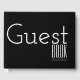 Ett vackert, fetstilt vitt teckensnitt säger "gäst bok" och har en mall under det för datumet för din viktiga funktion eller händelse. Bakgrunden kan ändras från svart till valfritt färg.