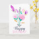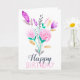 En elegant, gigantisk mjuk pastellhandmålad blommigt med blommor av rosa, blått, lila och grönt abstrakt fält med en kalligrafi av modern penseltypografi som säger grattis på födelsedagen.