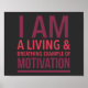 Typografi som säger att jag är ett levande och andningsfullt exempel på motivation. Motivering poster med svart bakgrund.