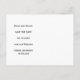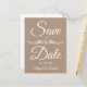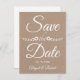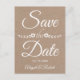 Handskrivet vykort för typografi av vitblommor med papper blommigt bröllop spara datum. Den visar namn i vitt bläck i ett kursivt skript med handskrivet stil typografi och två små vita blommor med löv på båda sidor av stormen.
