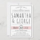 Modern svartvit typografi av bröllop pars duschinbjudan accentuerad med rosa. Den visningar texten i svart på vitt och datum för möhippan på en rosa banderoll. Det finns en svart gräns runt den. På baksidan finns ett mönster med vitt kor på rosa.