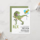 Söt 3-års inbjudan för en liten pojke med en glad tyrannosaurus och några gröna, blå och orange ballonger och en dekorativ grön rubrik. Denna tre rex dinosaurie 3-års inbjudan är idealisk för en liten pojke som gillar dinosaurier, blir tre år och har en t rex dinosaurie tema tredjedagsfest.