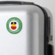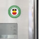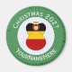 Rund magnet för juldekoration med en ängel iklädd Tysklands flagga. Den tyska julängeln finns inuti en vit cirkel av snurriga rutor med en bakgrund av gröna snurriga rutor. Lägg till din egen text om du vill. Personliggör med ett namn och anpassa med året. Rolig strumplåda. Hedra din tyska härkomst under julen.