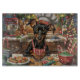 Fånga helgdag glädje att baka med den här härliga scenen med en glad kock omgiven av julgransar och festliga dekorationer. En hjärteberande firande av årstidens sötaste traditioner.