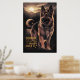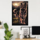 En tysk shepherd-hund står stolt över en bakgrund av berg vid soluppgången. Sol är stigning bakom hund och kastar en varm glöd på päls. Hund tittar direkt vid visningsprogrammet, med ett bestämt uttryck på ansikte. Under hund finns ett citat om mod.