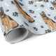 En bild av en tysk Shepherd-Hund är utmärkelsen i mönster på tillfällens pappra gåva. Hund sitter mitt i mönster på svart tass avtryck och vita ben och upprepas med silver blå bakgrund.