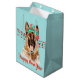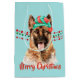 En vacker tysk Shepherd-Hund bär en röd och grönt Jultomten som står framför röda och grönt Jul pärlor på båda sidor om denna presentsäck. I grund finns text där fält matchar rött för din egen text. För närvarande säger den ena sidan "God jul" och den andra sidan "Gott nytt år", men du kan ändra dem om du vill. Bilder och text placeras på en ljusare grönt. Se till att se matchande produkter i vår butik.