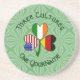 Personlig rund underlägg som visar flaggorna för Tyskland, Irland och Amerikas förenta stater (USA) i bladen på denna shamrock, designad för att fira St. Patricks dag, 4 juli och tyska helgdagar. Den sitter på en fraktal bakgrund av ljusgröna snurriga rutor. Ovanför står orden TRE KULTURER. Nedanför, EN YOURNAME. Orden är i mörkgröna, keltiska, cirkulära bokstäver. Lägg till ditt namn på rätt plats för en personlig utseende. Behöver du en present? Lägg bara till någon annans namn. Bra för dina gäster på St. Patricks dag.