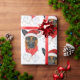 Den tyska Shepherd-julfärgens Hundraser har en vacker vattenfärg av en tysk Shepherd med en röd julklapp och en röd julklapp och en bakgrund med färgstarka vattenfärgsstjärnor.