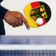 Jacka av Tyskland arm. Jacka av arm av Tysklanda visningar en svart örn (Bundesadler ’Federal Eagle’, tidigare Reichsadler ’Imperial Eagle’) på en gult sköld (eller en örn som visas på ett bord). Det är ett återinförande av den jacka av arm från Weimarrepubliken (i användan 1919-1935) som antogs av Förbundsrepubliken Tysklanda 1950. Den nuvarande utformningen av officiellen beror på Tobias Schwab (1887-1967) och infördes 1928.