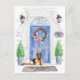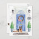 Meddela din ny adress med vår snyggt med en tysk shepherd, blå ytterdörr, välkomstmat, skifferskylt, toparies och en blommigt krans på en grått tegelbakgrund.