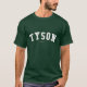 Tyson! Är ditt namn Tyson? Eller har du en make, en pojkvän, en male familjemedlem eller en manlig vännen namngav Tyson? Om så, är denna "baner" skjorta exakt gåvan som du söker efter! Designen presenterar "Tyson" i välvd vitbokstäver över bröstkorgen i klassikerhögskolastilsorten.
