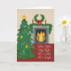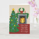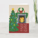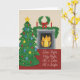 Julkortet har en vattenfärg porträtt i ett mysigt julvardagsrum med texten Tyst natt.