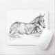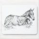En svart och vit BIRO-illustration (kulspetspenna)/teckning av en ung häst på marken som just vaknar upp från tuppen. Av BIRO Artist Robin Hewitt.