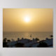 Se över bungalow-komplexet till havs med en segelbåt vid solnedgång, i Costa Adeje, Spanien, Tenerife