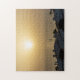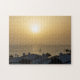 Se över bungalow-komplexet till havs med en segelbåt vid solnedgång, i Costa Adeje, Spanien, Tenerife