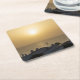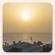 Se över bungalow-komplexet till havs med en segelbåt vid solnedgång, i Costa Adeje, Spanien, Tenerife