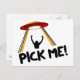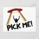 En bild av en flygande sågregat i tecknad stil, med en upprullningsstråle eller en sökningsljus som lyser ned på en figur med en silhuett av en person vars arm lyfts upp i luft. Plocka mig! är skriven i stort fet brev. Perfekt för den som vill bli lurad att gå med ett verkligt intelligent liv!