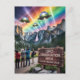 En grupp människor i ett viltlevande område med en skylt som säger UFO:s observationsområde Var snälla och håll Lugnen och UFOS som flyger ovanför i regnbågen himmel AI skapade scifi fantasy art
